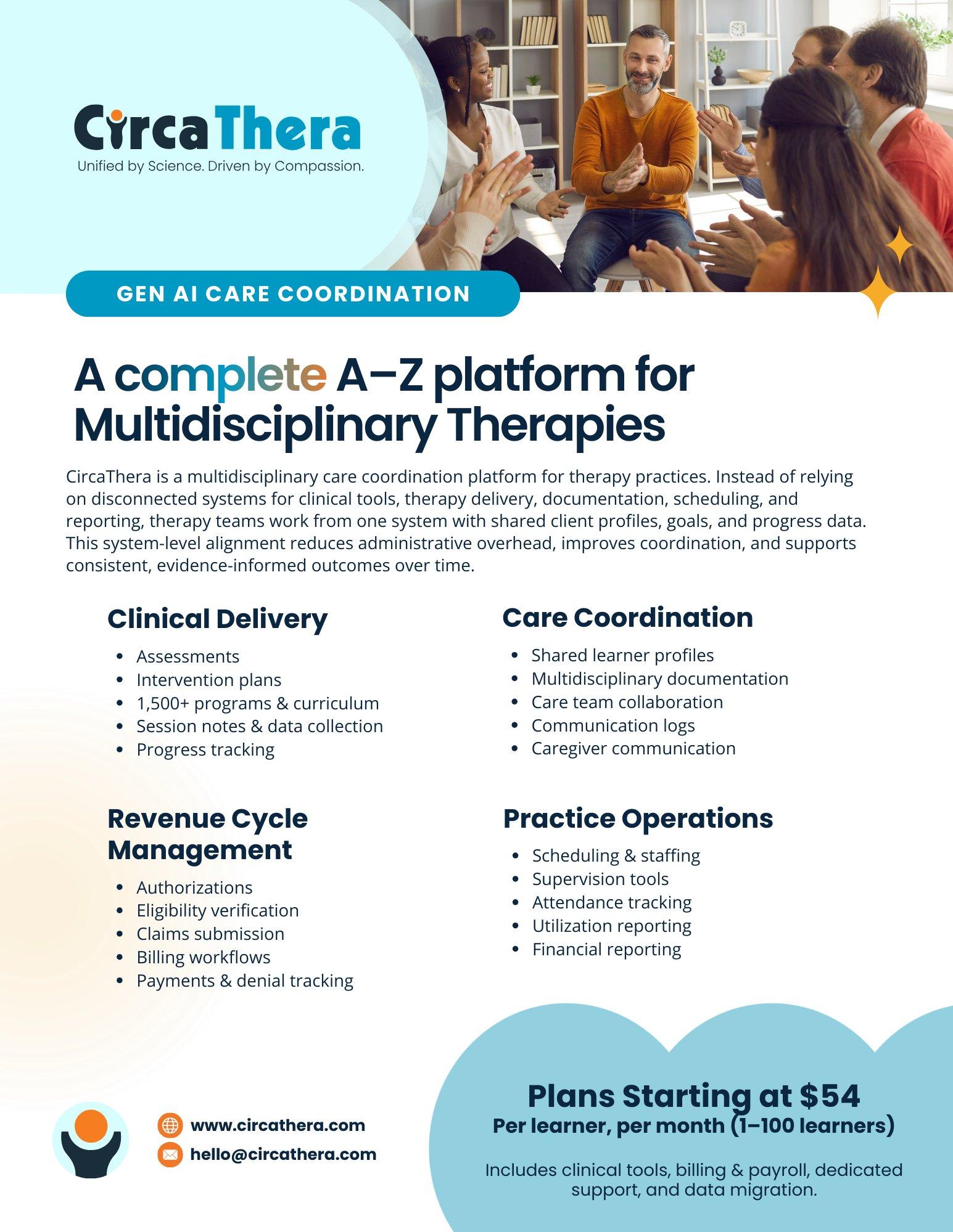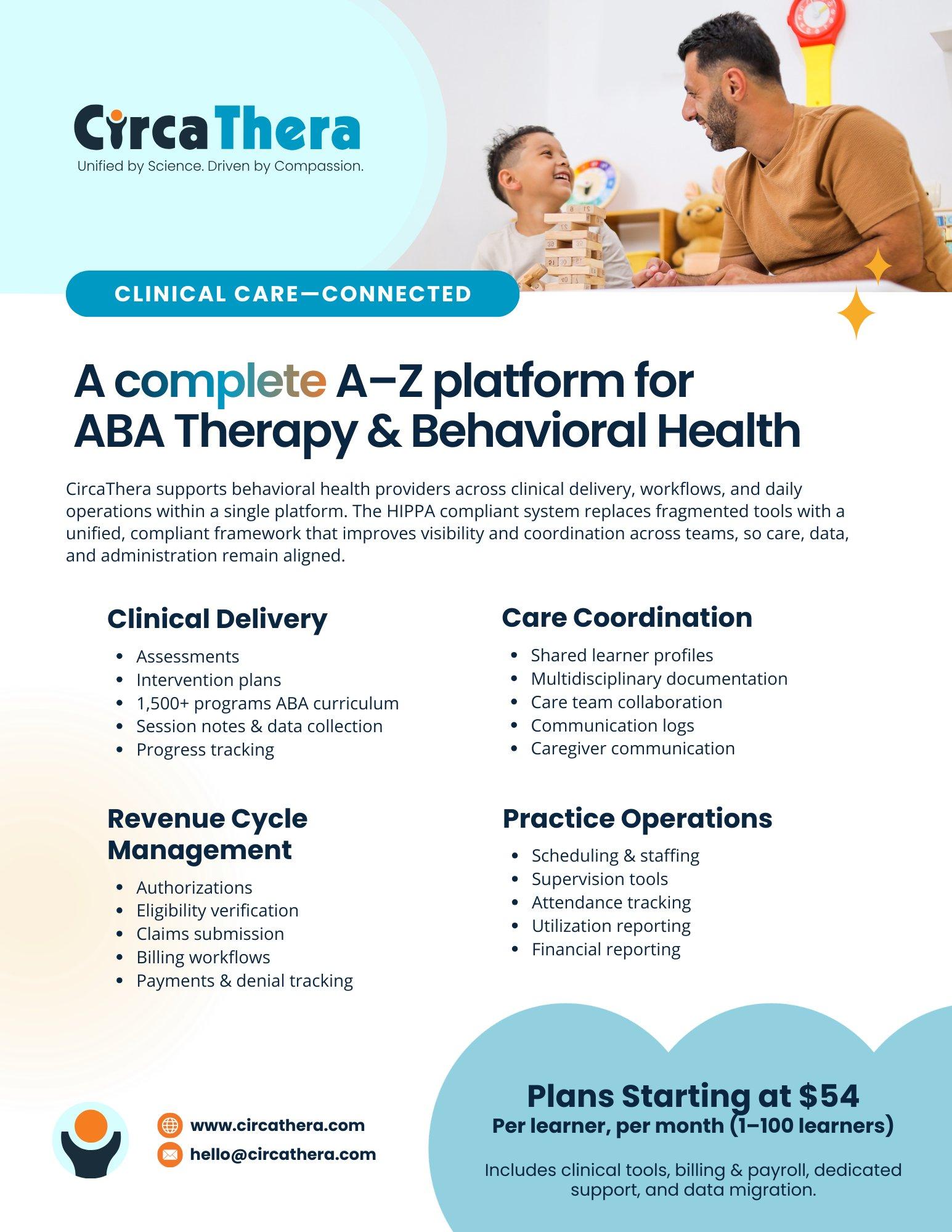 The jump from clinician to tech CEO wasn’t a pivot—it was an extension. Farshchian had built the lessons, the curriculum, and the tools to run her own practice effectively. The problem was that none of it could scale. So she created ABA Toolbox: an earlier ABA-focused technology platform and curriculum system developed from her clinical practice to automate ABA curriculum and program systems and make them available to other clinics, schools, and agencies. The concept was elegant—if one BCBA builds 1,500 programs that work, why should every other BCBA start from scratch?CircaThera represents the broader next generation of that vision—a multidisciplinary, AI-powered clinical operating system with a much larger mission and scope. The platform brings together providers across behavioral health, speech therapy, occupational therapy, physical therapy, mental health, and special education into a unified system that supports the full workflow from intake and assessment through goal development, documentation, scheduling, billing, and outcomes tracking. The goal is simple: enable professionals to coordinate care behind the scenes so families are not forced to carry the burden of connecting fragmented systems themselves.